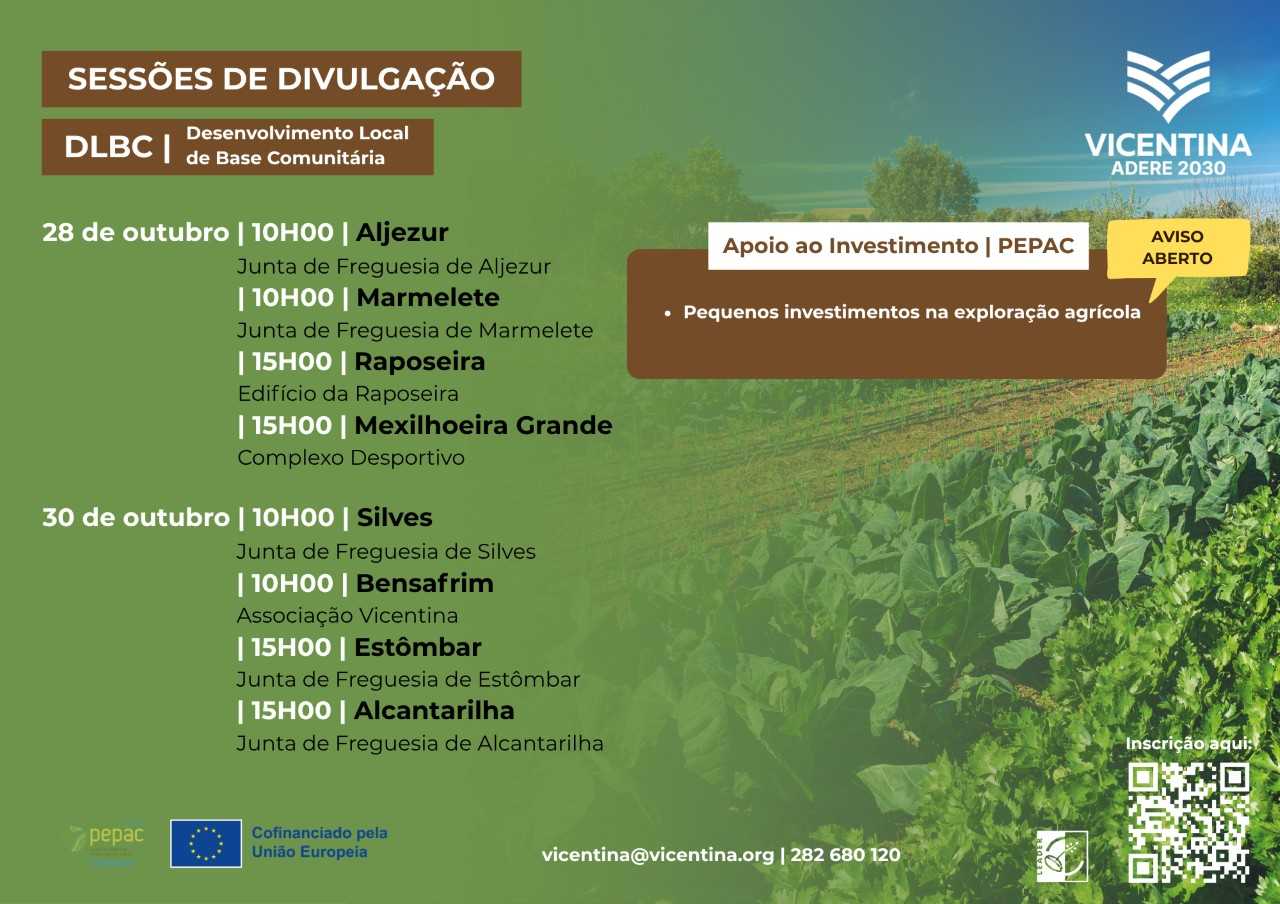 O GAL Vicentina Adere 2030 está a organizar um ciclo de Sessões de Divulgação e esclarecimento no âmbito do Aviso aberto para apresentação de candidaturas à Tipologia de Intervenção D.1.1.1.1 – Pequenos Investimentos nas Explorações Agrícolas, destinadas a informar e esclarecer agricultores, produtores e empreendedores rurais sobre oportunidades de investimento no território de intervenção deste GAL.